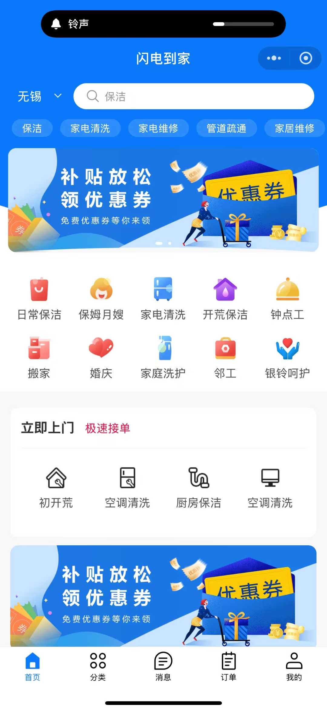 閃電到家是一款集日常保潔,保姆月嫂,家電清洗,家電維修,管道疏通,鐘點(diǎn)工,搬家,婚慶等多功能生活服務(wù)類小程序。